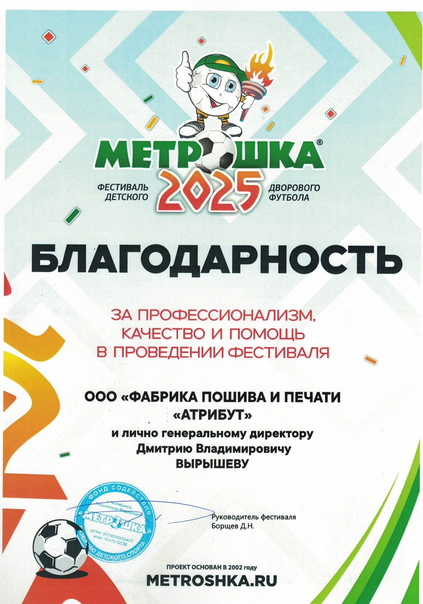 Благодарность ООО "Фабрика пошива и печати "Атрибут" за интересное, плодотворное сотрудничество, за быстрое и качественное решение всех возникающих вопросов, за внимательность и прекрасное отношение со стороны сотрудников Вашей компании.
